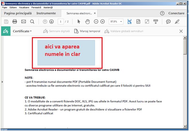 Pe documentul PDF unde ati desenat dreptunghiul, va aparea numele in clar si data cand ati semnat cu certiticatul calificat: